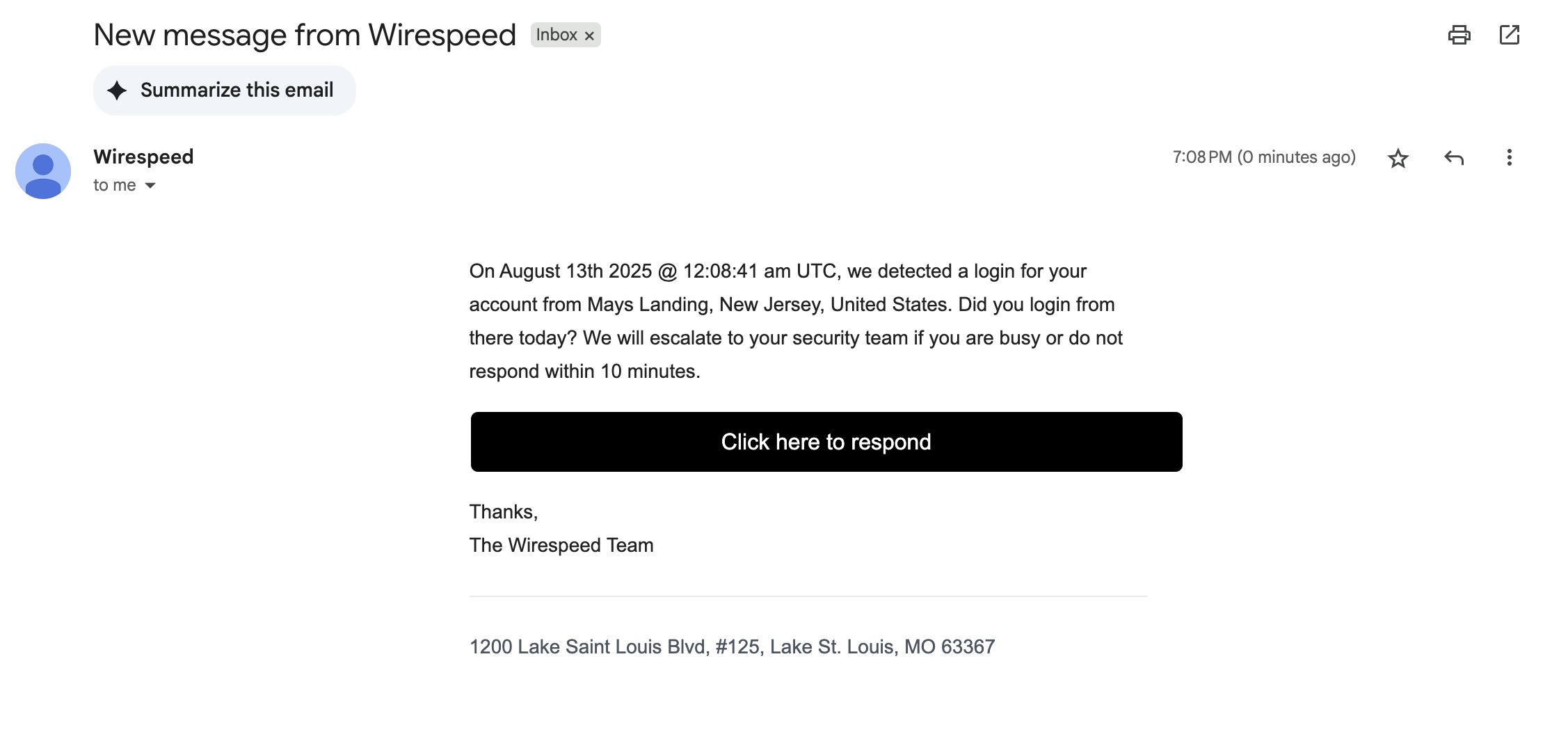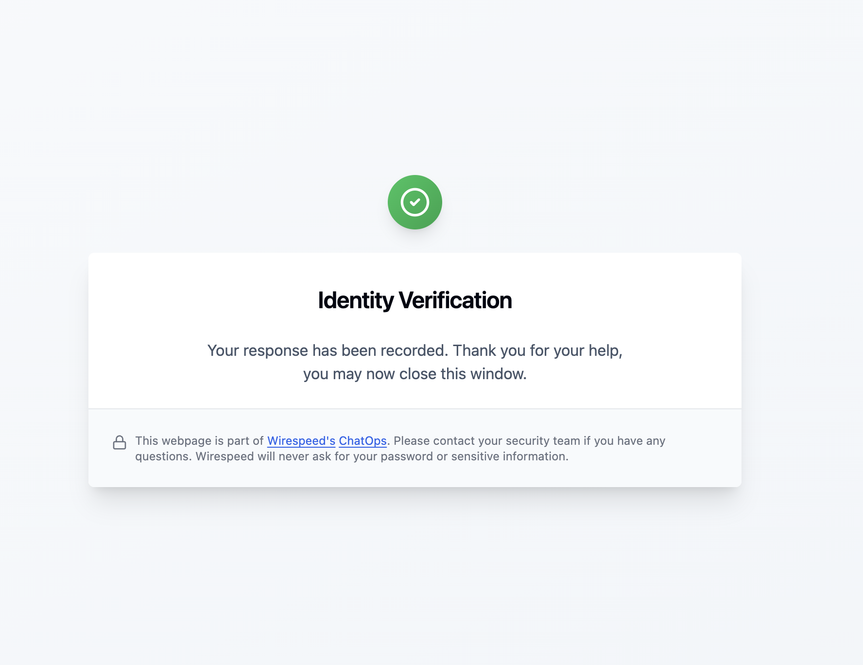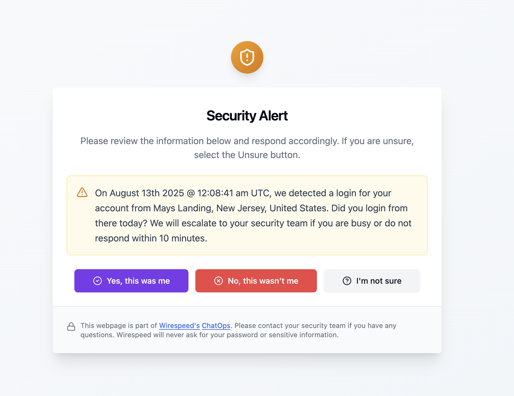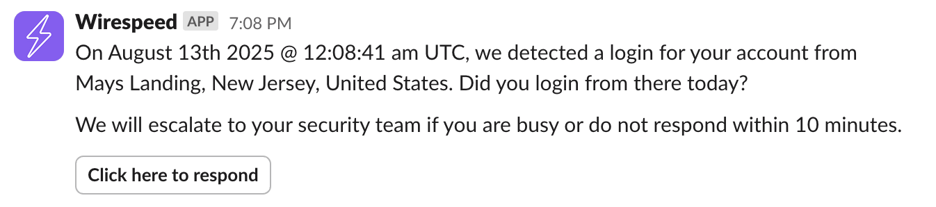 It’s also a good idea to send an organization-wide message about rolling out Wirespeed, using the normal communication channels they would expect to see important updates, such as an organization-wide chat channel or official email address responsible for security or tech changes. Here’s an example template you could start from:Hi Team, This is a quick note to let you know that we have started using a cybersecurity monitoring app called Wirespeed which will occasionally message you asking you questions about your online activity, such as logging in from unusual locations. To the best of your ability, please answer any questions from the app so we can all make sure to keep our organization safe from hackers and ransomware. Wirespeed’s goal is to be painless and only ask you when it matters. Please also note that Wirespeed will never ask you for sensitive information, like your password, bank account, or government ID numbers! A screenshot of an example Wirespeed message is below. Thanks and please let us know if you have any questions! - Security Team