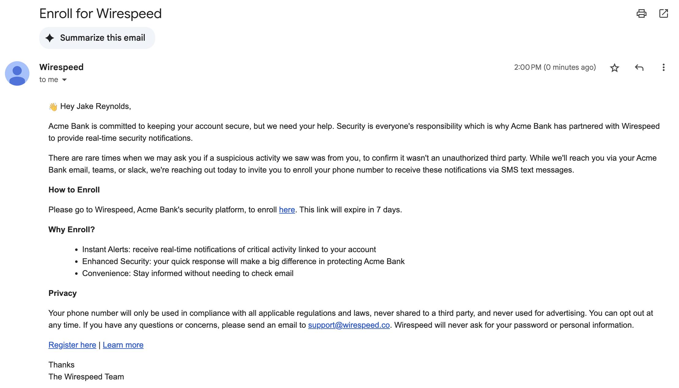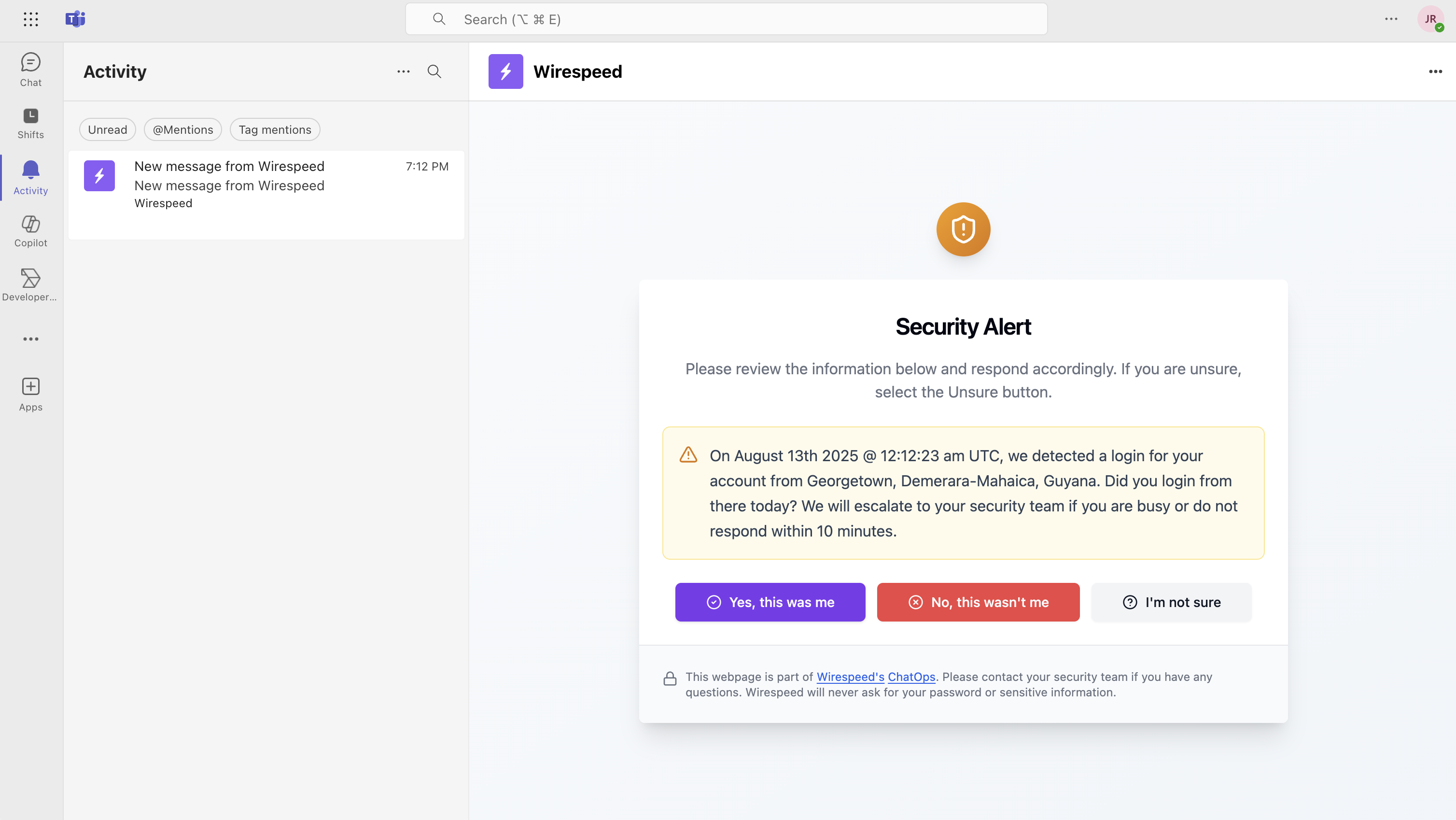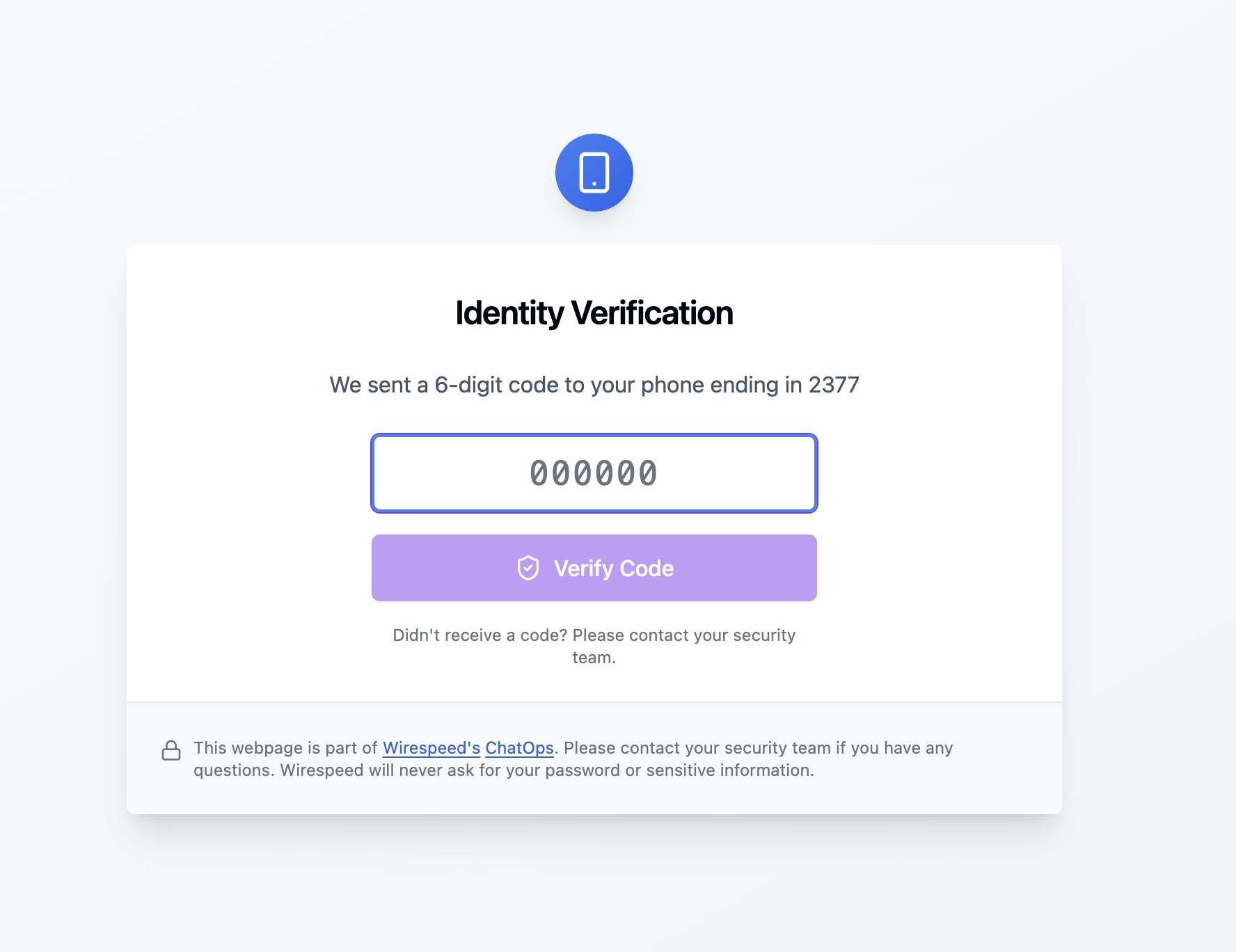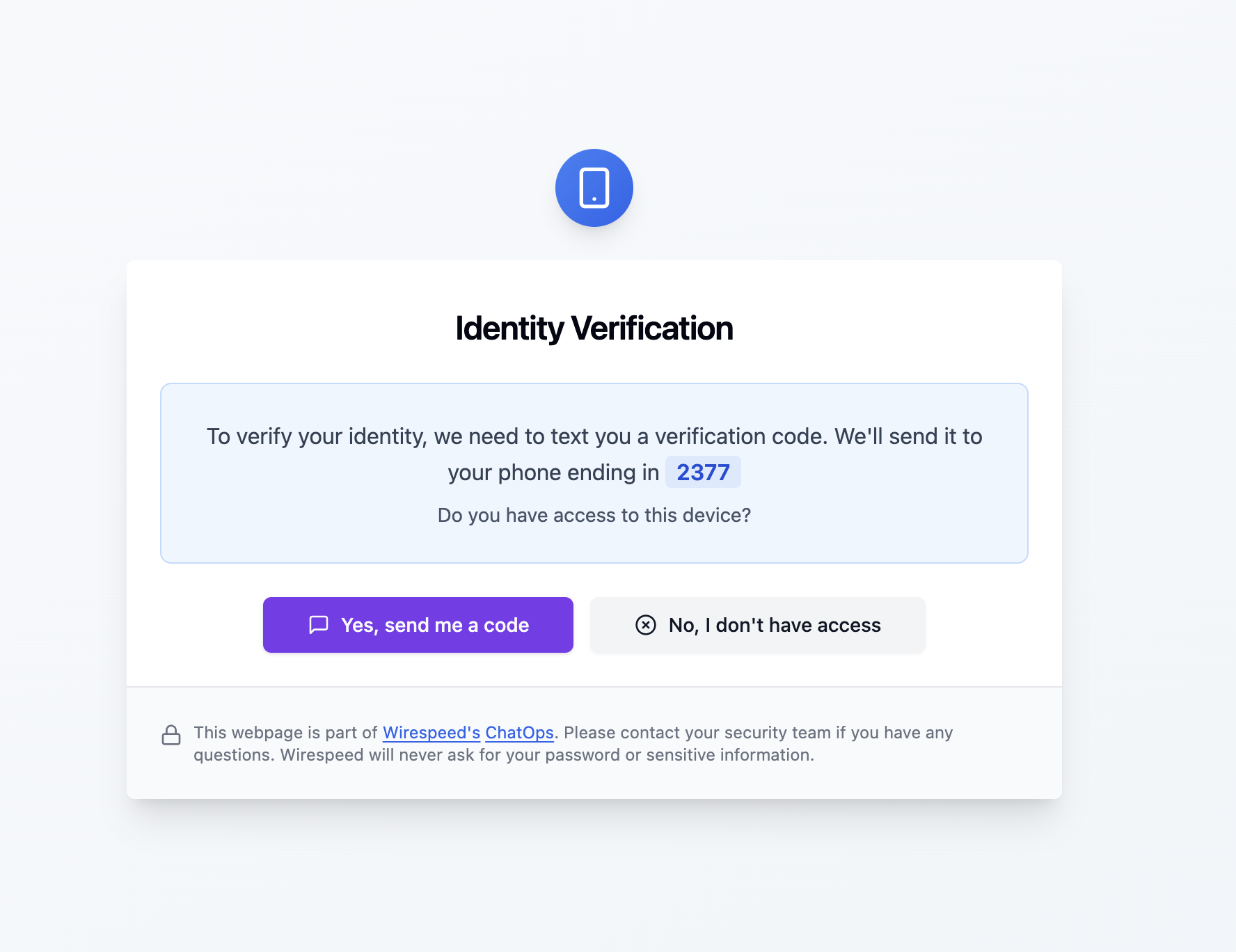 It’s also a good idea to send an organization-wide message about rolling out Wirespeed, using the normal communication channels they would expect to see important updates, such as an organization-wide chat channel or official email address responsible for security or tech changes. Here’s an example template you could start from:Hi Team, This is a quick note to let you know that we have started using a cybersecurity monitoring app called Wirespeed which will occasionally message you asking you questions about your online activity, such as logging in from unusual locations. To the best of your ability, please answer any questions from the app so we can all make sure to keep our organization safe from hackers and ransomware. Wirespeed’s goal is to be painless and only ask you when it matters. Please also note that Wirespeed will never ask you for sensitive information, like your password, bank account, or government ID numbers! A screenshot of an example Wirespeed message is below. Thanks and please let us know if you have any questions! - Security Team